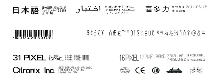 loghi, grafica e codici a barre lineari e 2D DataMatrix; multi-lingue; grassetto; maiuscole